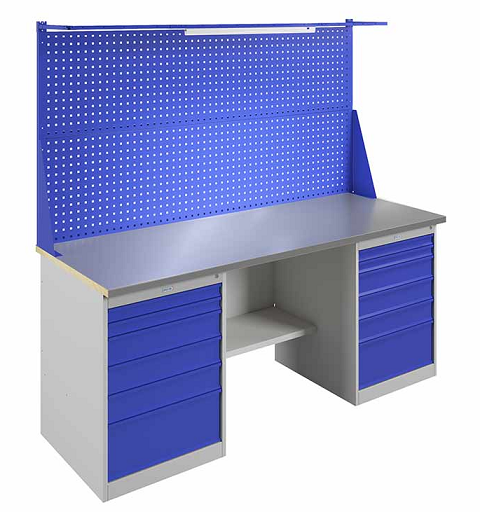 Купить верстак можно в формате обычного металлического стола на ножках. Также выпускаются однотумбовые и двухтумбовые модели. Тумбы с выдвижными ящиками позволяют удобно складировать рабочий инструмент и необходимый инвентарь. Однотумбовые модели лучше подойдут для помещений малой площади. Двухтумбовые рабочие столы можно ставить в большой мастерской.