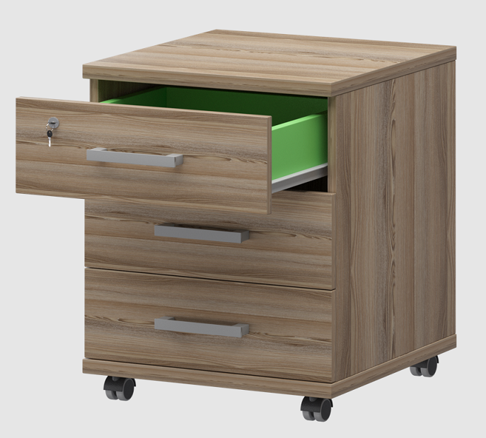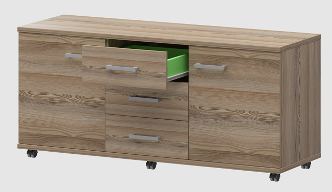 Ключевые определения дизайна – строгость, простота, достоинство и одновременно легкость. Декор ЛДСП сделан по технологии тиснения «шпон», его фактура создает необычайное зрительное и осязаемое ощущение теплоты натурального дерева. В производстве серии «Аргентум» используется ламинированная ДСП с меламиновым антибликовым покрытием толщиной 25 мм и 16 мм. Торцы облицованы противоударной кромкой ПВХ, толщиной 2 мм, в цвет корпуса ЛДСП.