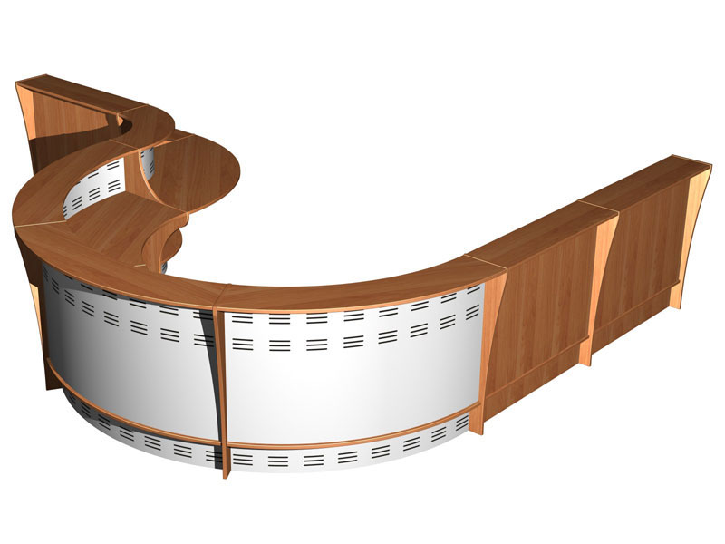 За стойкой ресепшн могут работать одновременно несколько сотрудников, поэтому при разработке дизайн-проекта для зоны ресепшн вашего офиса необходимо учитывать в первую очередь удобство и функциональность стойки ресепшн. Еще одна отличительная особенность стойки ресепшн Формула — секция выгнутая наружу на 90 градусов. Такая секция может служить отдельным рабочим местом, что в аналогах встречается достаточно редко. Для этого она вполне вместительна и устойчива. Секция вогнутая внутрь на 90 градусов также уникальна своими компактными размерами. Полки, столешницы и опоры выполнены из ЛДСтП 22 мм; экраны прямых секций — ЛДСтП 18 мм. Кромка — ПВХ 2,0 мм.