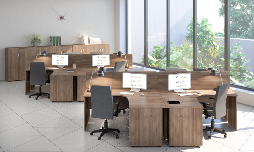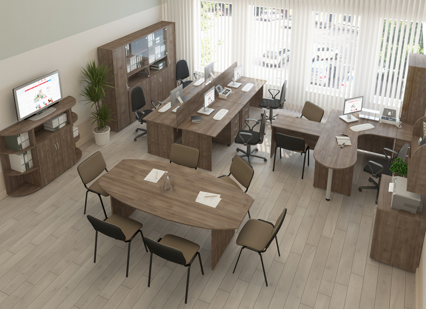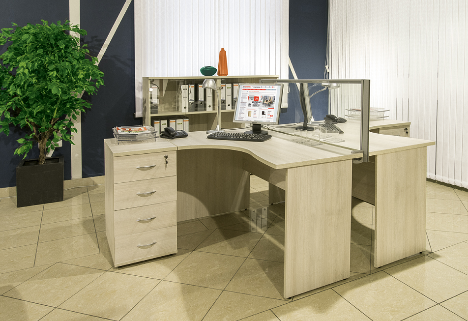 Столешницы, топы тумб и шкафов – 25 мм, кромка ПВХ 2 мм. Боковые опоры столов, каркасы тумб и шкафов – 18 мм, кромка ПВХ 0,4 мм. Широкий модельный ряд письменных и эргономичных столов. Вся шкафная группа представлена в 2-х типоразмерах ширины: широкие 80 см и узкие 40 см. Конструктивная возможность комплектации шкафов разнообразными дверями